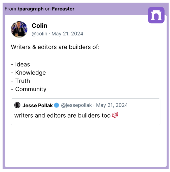 Jesse Pollak, founder of Base, has said, “Writers and editors are builders too.” Colin Armstrong, founder of Paragraph, added that writers and editors are builders of ideas, knowledge, truth, and community. Steve Jobs once said, “The most powerful person in the world is the storyteller. The storyteller sets the vision, values, and agenda of an entire generation that is to come.” Mario Gabriele, founder of The Generalist, launched a VC fund on the promise of narrative power.